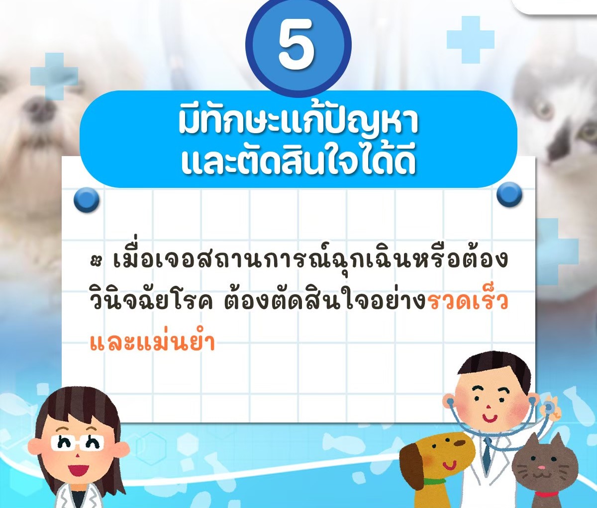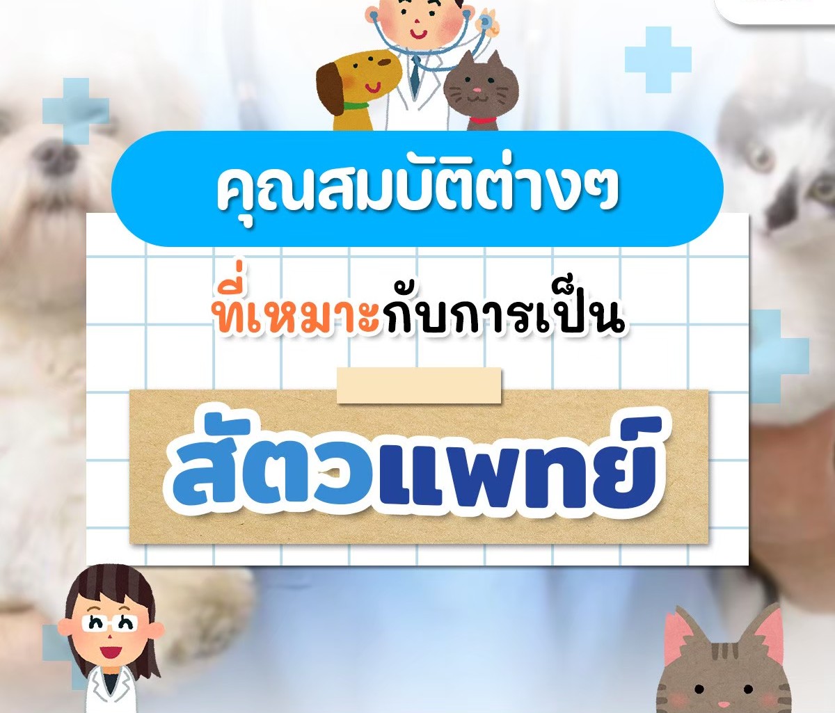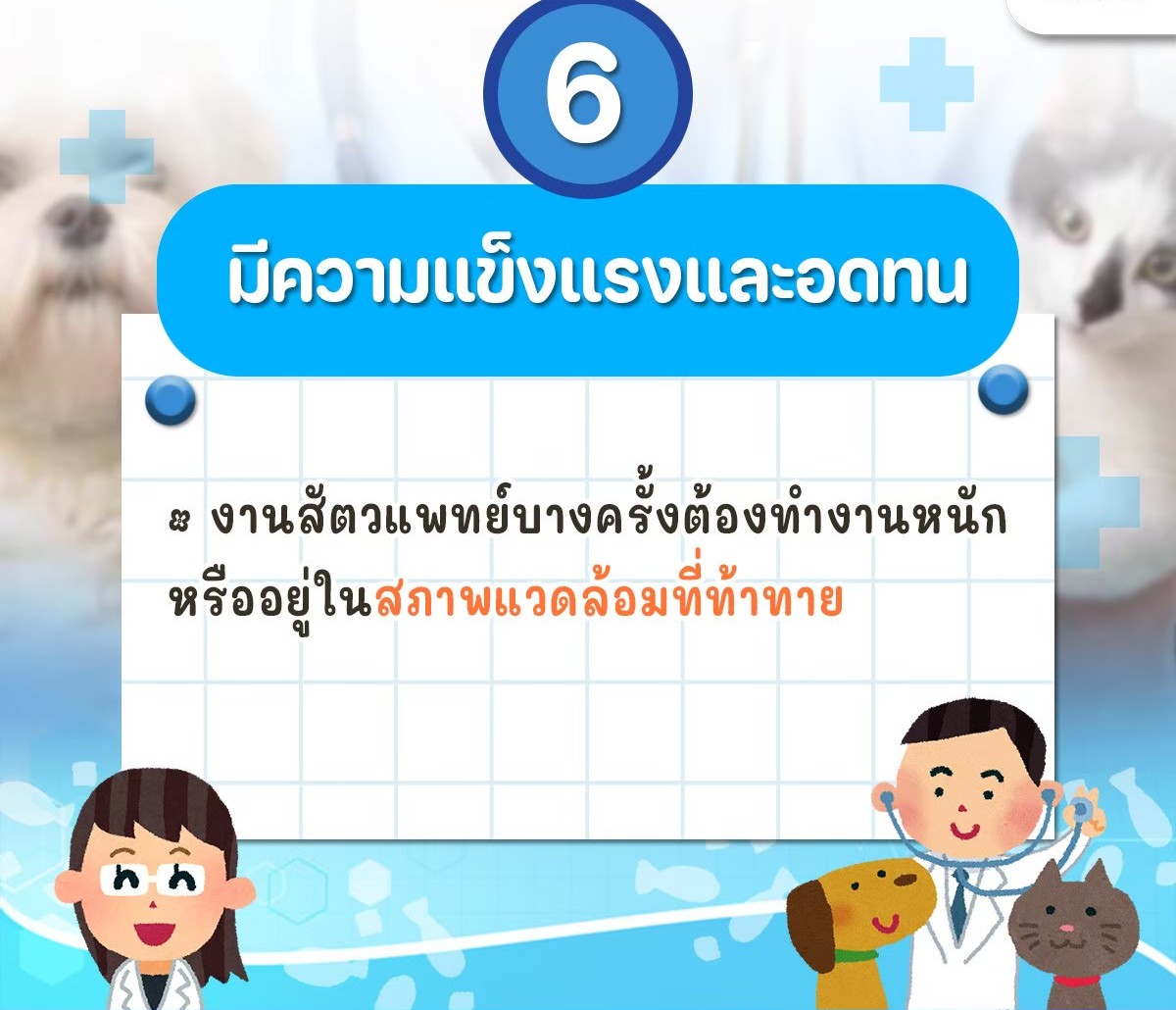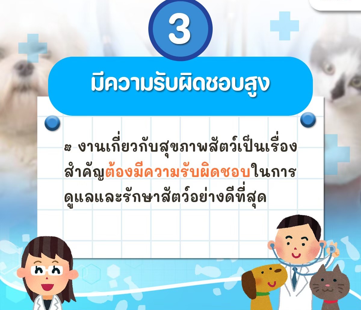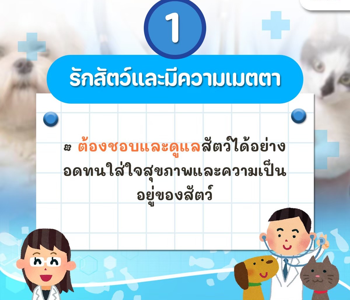 หลายคนอาจมองว่าการเป็นสัตวแพทย์ขอแค่ "รักสัตว์" ก็พอ แต่ในความเป็นจริง หน้าที่นี้ต้องอาศัยทักษะ Soft Skills และ Hard Skills ควบคู่กันไปอย่างมากครับ วันนี้ขอนำข้อมูลดี ๆ เกี่ยวกับคุณสมบัติที่เหมาะสมสำหรับสายงานนี้มาแบ่งปันกัน