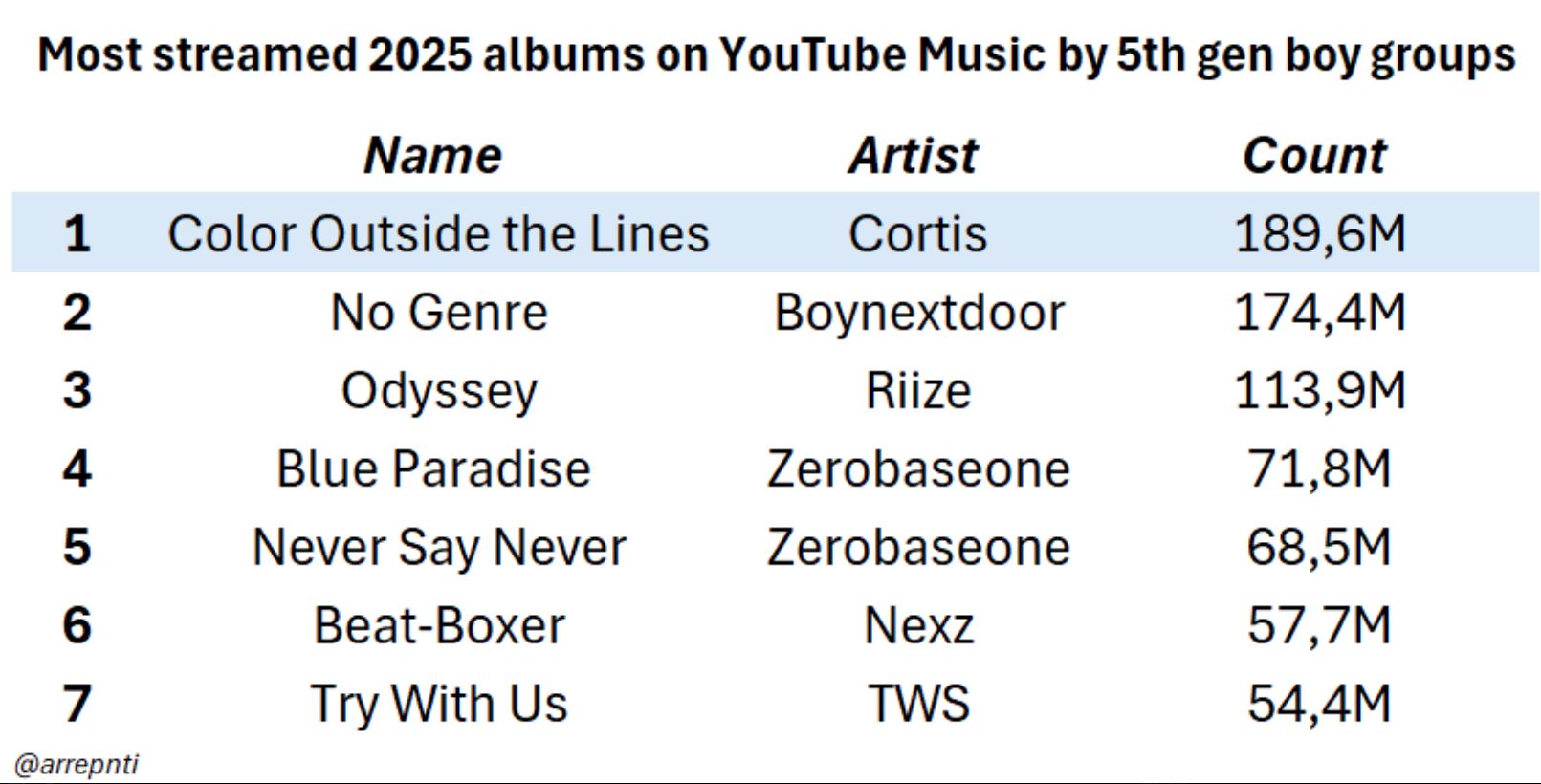 ด้วยยอดสตรีม 189.6 ล้านครั้ง อัลบั้มเดบิวต์ Color Outside the Lines ของ Cortis จึงเป็นอัลบั้มที่มียอดสตรีมมากที่สุดในปี 2025 ของบอยกรุ๊ปรุ่นที่ 5 บน YouTube Music!