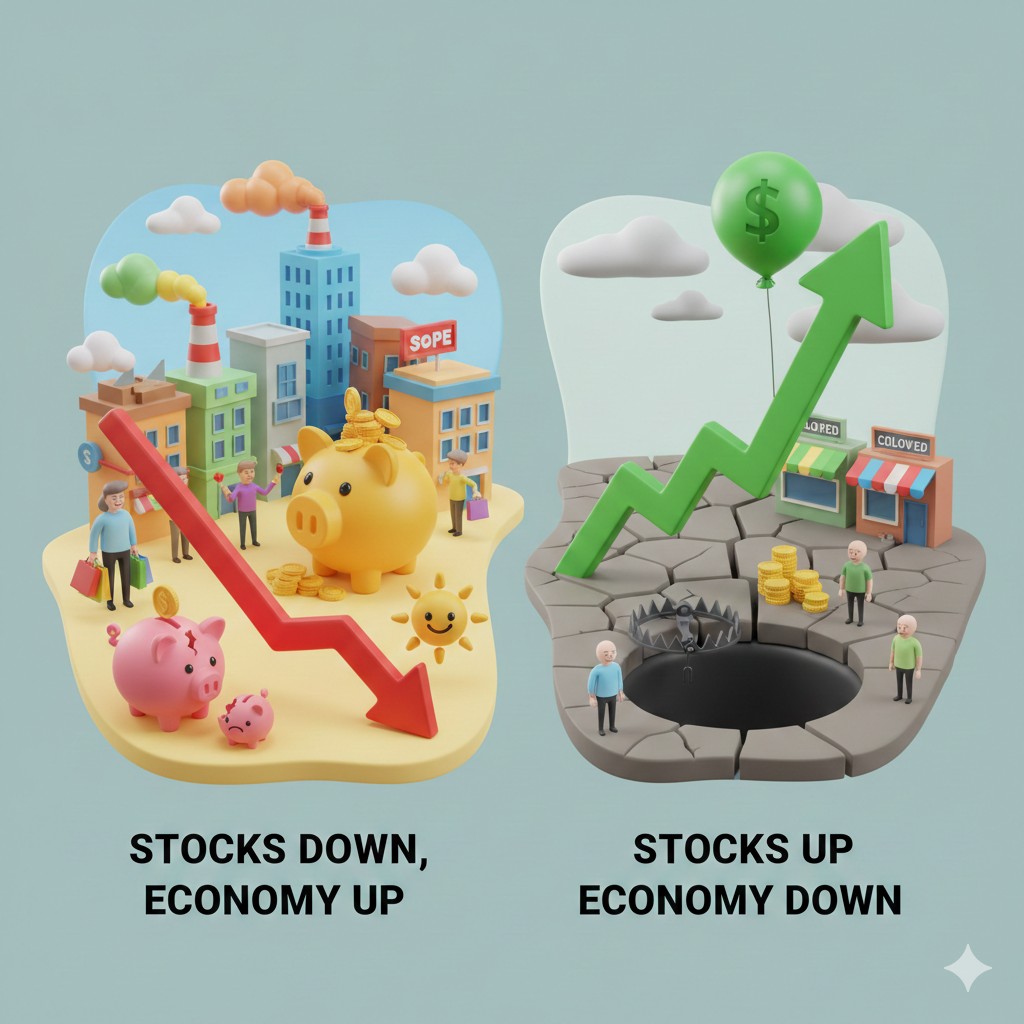 คุณเคยสงสัยไหมว่า ทำไมบางครั้งเดินไปห้างไหนคนก็เต็มร้าน ข้าวของขายดีจนผลิตไม่ทัน แต่หน้าจอแอปฯ เทรดหุ้นกลับแดงเถือกเหมือนเลือดอาบ? หรือในทางกลับกัน ทำไมช่วงที่คนบ่นว่าตกงาน ข้าวของแพง เศรษฐกิจซบเซา แต่ดัชนีหุ้นกลับพุ่งทะยานทำ High ใหม่เฉยเลย?