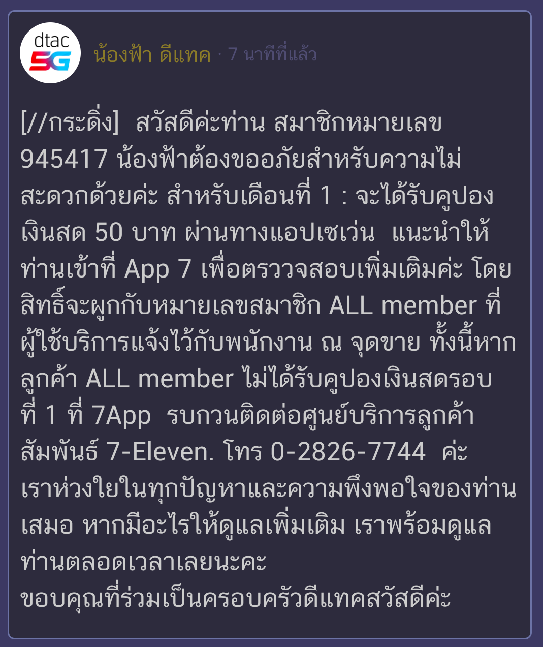 สรุปเปิดซิม ไม่ได้รับโค้ด7-11 ถือว่าทำบุญให้ Dtac ไปครับ 50 บาท