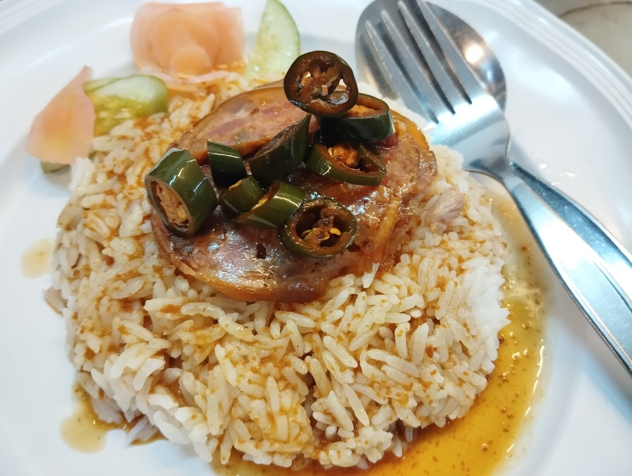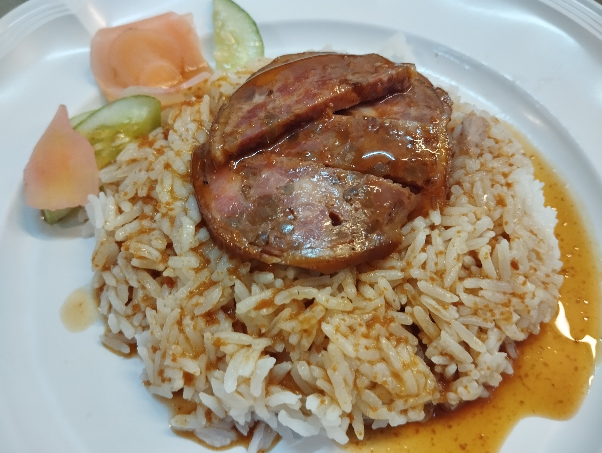 รอไม่นานก็ได้รับอาหารละ จานนี้ของผมเอง ขาหมูยัดไส้ เมนูโปรดสำหรับผมของร้านนี้ อึ้งกับหน้าตาอยู่พักนึงว่าทำไมมันขี้เหร่กว่าเมื่อก่อนจังฟ่ะ ขาหมูเมื่อก่อนจะหั่นมาเป็นแว่น ๆ สองสามชิ้นหนา ๆ น่ากินกว่านี้เยอะแยะ น้ำซอสก็ดูใส ๆ ไม่หอมไม่มีกากเนื้อเครื่องเทศให้เห็นเลย