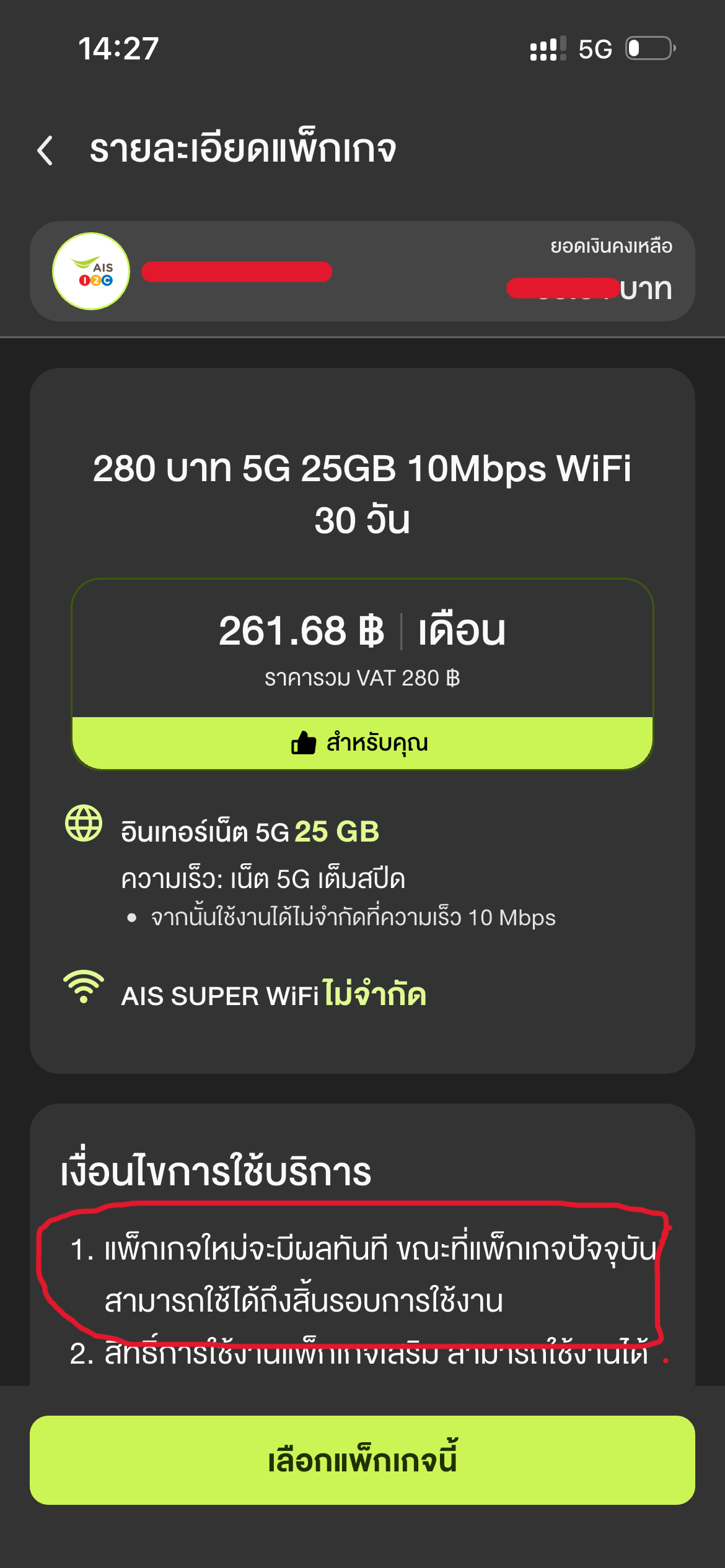 เห็นข้อเสนอเน็ตที่ขึ้นมา แล้วมีเงื่อนไขว่า แพ็กเกจใหม่มีผลทันที ขณะที่แพ็กเกจปัจจุบันสามารถใช้ได้ถึงสิ้นรอบการใช้งาน