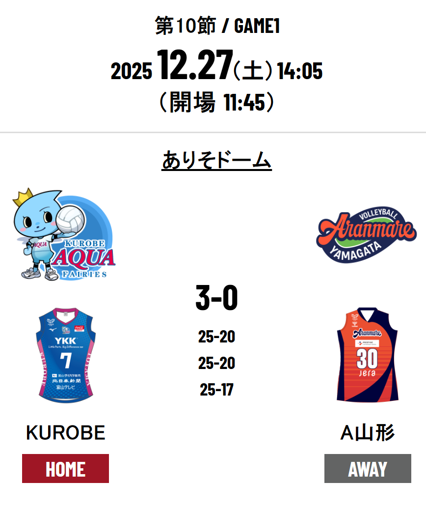 KUROBE Aqua Fairies 3 - 0 Aranmare Yamagata