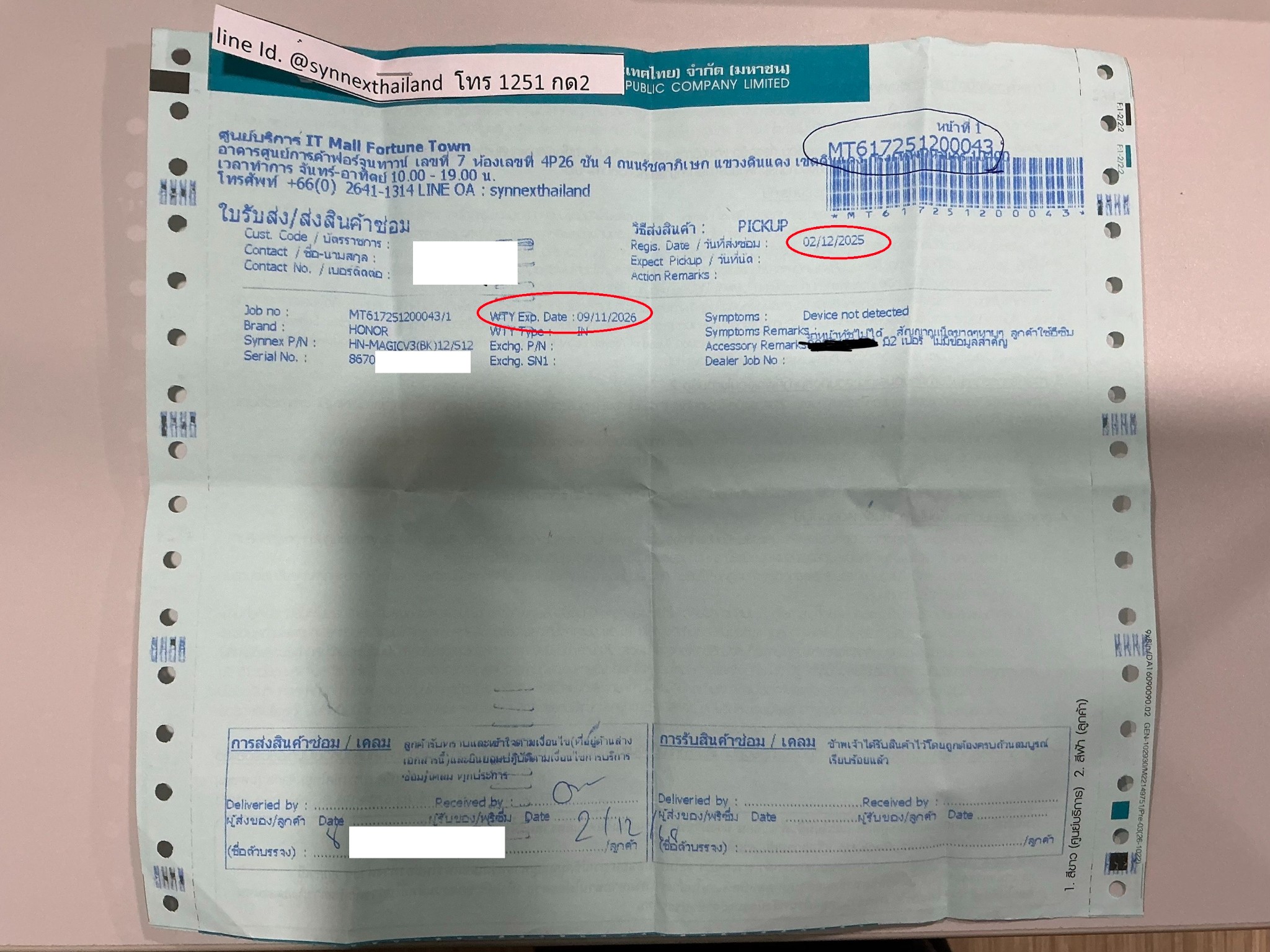 มือถือของเรา เป็นยี่ห้อ Honor รุ่น Magic V3 ส่งซ่อมผ่าน Synnex ที่สาขาฟอร์จูนไปเมื่อวันที่ 2 ธ.ค. 2568