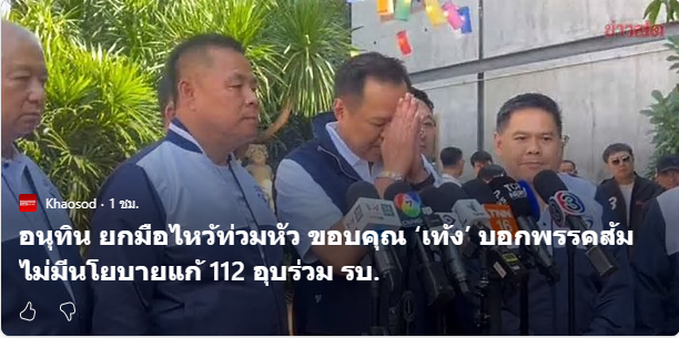 อนุทิน ยกมือไหว้ท่วมหัว ขอบคุณ‘เท้ง’บอกพรรคส้มไม่มีนโยบายแก้112 อุบร่วม รบ.