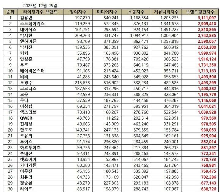 สมาชิกวง CORTIS ทุกคนติดอันดับในการจัดอันดับความนิยมแบรนด์บอยแบนด์รายบุคคลประจำเดือนธันวาคม 2025 KEONHO (#20) — 640,883 JAMES (#26) — 474,337 MARTIN (#40) — 376,638 JUHOON (#71) &md