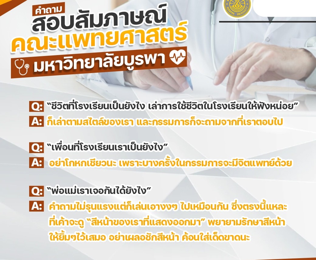 โค้งสุดท้ายของการเตรียมตัว! น้องๆ คนไหนที่เล็งคณะแพทยศาสตร์ มหาวิทยาลัยบูรพาไว้ แต่ยังประหม่าเรื่อง "สอบสัมภาษณ์" กลัวเจอคำถามจิกกัด หรือไม่รู้จะวางตัวยังไง... ฟังทางนี้เลยยย!