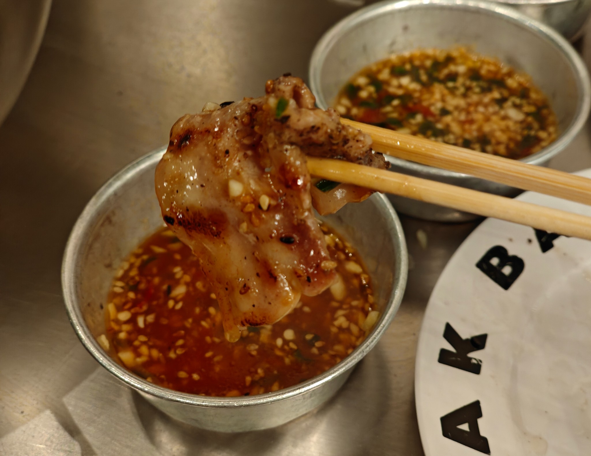 ต้องรีบเอาเนื้อหมูลงไม่งั้นกากหมูจะไหม้ก่อน เร่งมือๆหอมมากกก ย่างหมูสุก จะกินแบบจิ้มเปล่าหรือตักผัก ตักกากหมูเจียว โรยน้ำจิ้ม ได้หมด เข้าปากแล้ว .... อื้อหือ ส่วนตัวแล้วชอบมาก น้ำจิ้มกินคู่แล้วดีงาม ถูกปากอร่อยมาก