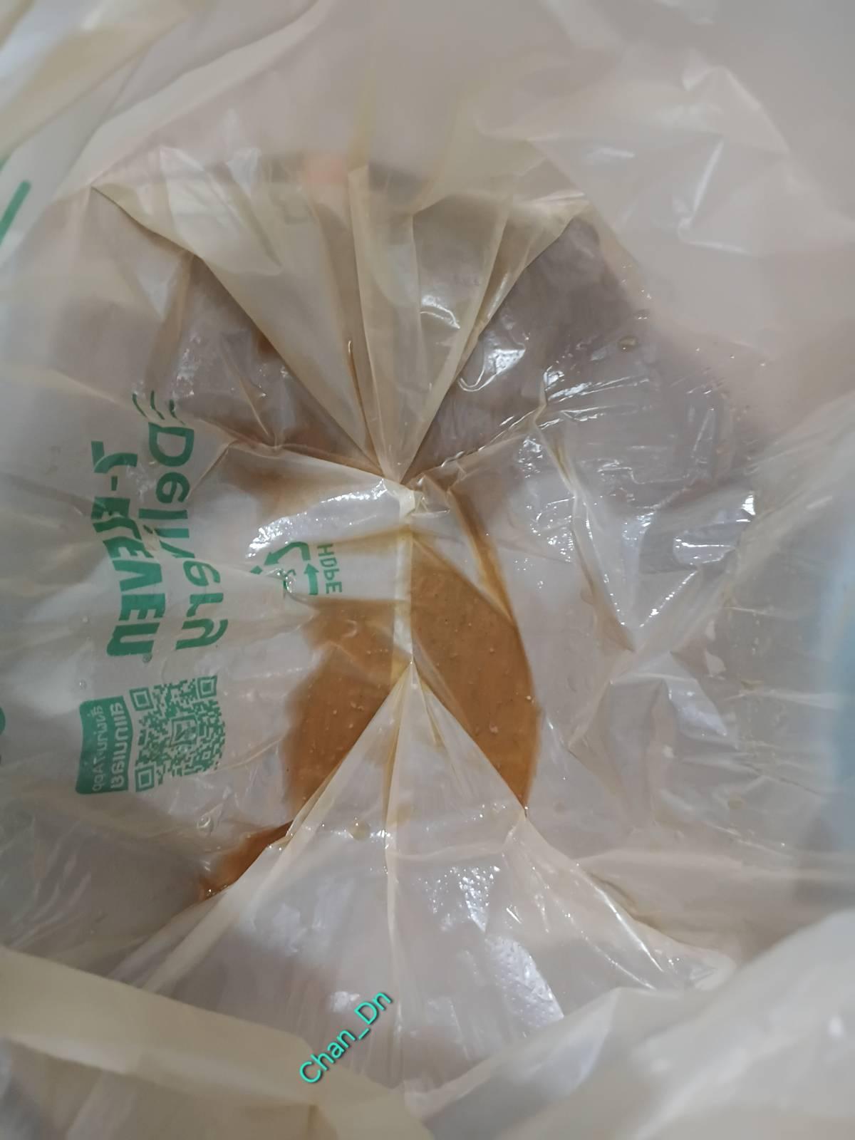 ขนาดถือแบบระวังแล้วนะ เคยซื้อรอบแรกก็หกแบบนี้เหมือนกัน ตอนนั้นคิดว่าเพราะไม่ระวังแหล่ะ รอบนี้เลยหิ้วแบบระวังๆก็ยังมีน้ำหกออกมาเปื้อนถุงอยู่ดี