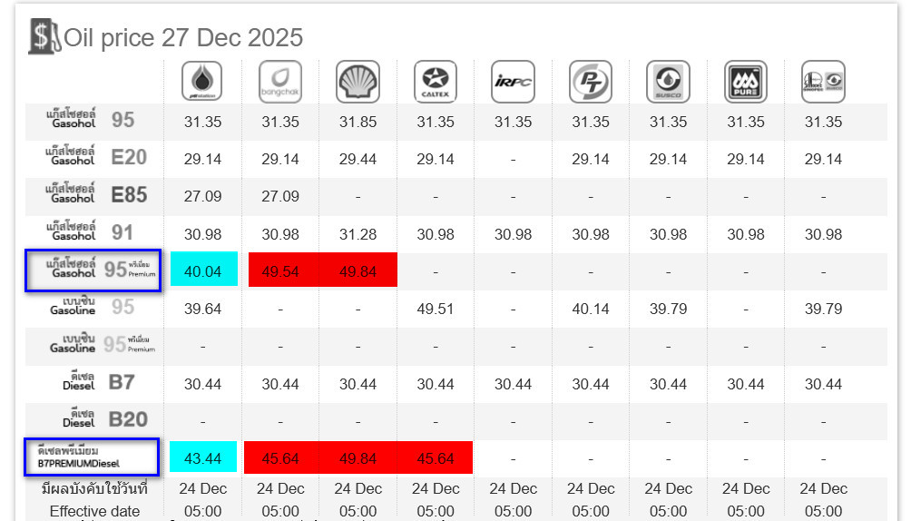 ผมไล่ดูราคาจากปั๊มหลัก ๆ ทั้ง Shell / Bangchak / Caltex / Susco / และ PTT Station