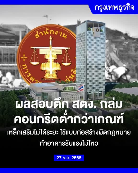 ผลสอบออกแล้ว ตึก สตง. ถล่ม คอนกรีตต่ำกว่าเกณฑ์ ไม่ได้มาตรฐาน เหล็กเสริมไม่ได้ระยะ ใช้แบบก่อสร้างผิดกฎหมาย ทำอาคารรับแรงไม่ไหว อัยการสั่งฟ้องกราวรูด 23 ราย