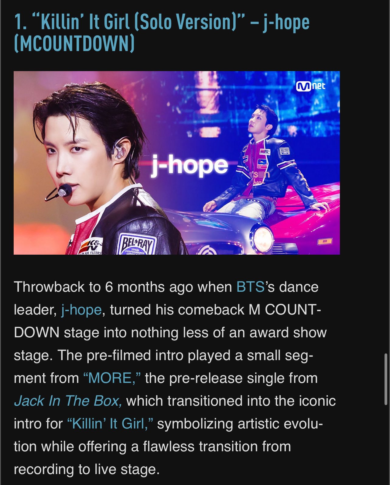 ย้อนกลับไปเมื่อ 6 เดือนก่อน  เมื่อ เจโฮป  หัวหน้าเต้นของวง  BTS  ได้เปลี่ยนเวทีการคัมแบ็กในรายการ M COUNTDOWN ให้กลายเป็นเวทีประกาศรางวัลอย่างยิ่งใหญ่ อินโทรที่บันทึกไว้ล่วงหน้าฉายส่วนเล็ก  ๆ จากเพลง  “MORE”   ซิงเกิลพรีลีลิสจากอัลบั้ม  Jack In The Box ก่อนจะเปลี่ยนไปเป็นอินโทรสุดไอคอนิกของเพลง  “Killin' It Girl”  ซึ่งเป็นสัญลักษณ์ของการพัฒนาทางศิลปะ พร้อมทั้งเป็นการเปลี่ยนผ่านที่ไร้ที่ติจากช่วงบันทึกเสียงสู่การแสดงสด