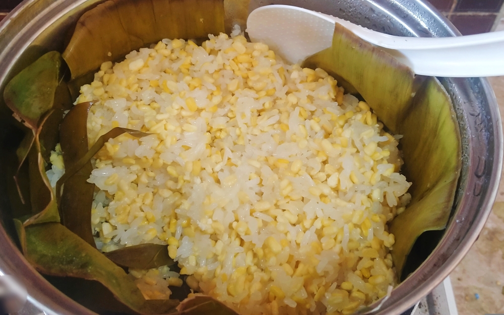 พ่อนึ่งข้าวเหนียวถั่วเหลือง กับ ทอดจ๋ายอ ไว้ให้