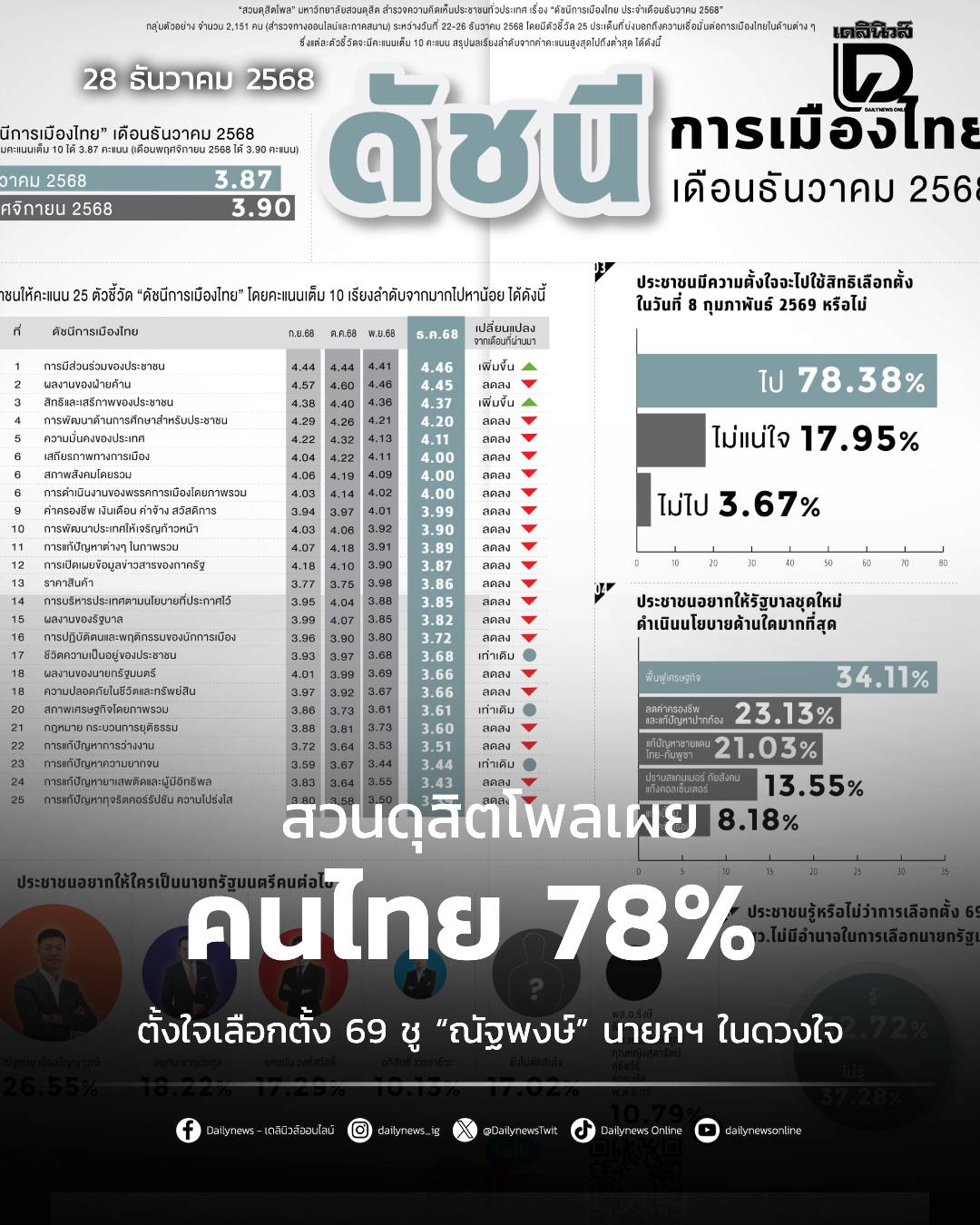 สวนดุสิตโพลเปิดผลสำรวจส่งท้ายปี 68 ดัชนีการเมืองร่วงเหลือ 3.87 คะแนน พบประชาชนตื่นตัวโหมดเลือกตั้งพุ่งสูง แต่กังวลหนักปัญหาทุจริต-ปากท้อง เผย “ณัฐพงษ์ เรืองปัญญาวุฒิ” นำโด่งบุคคลที่อยากให้เป็นนายกฯ มากที่สุด ขณะที่นักวิชาการห่วงคนเกือบ 40% ยังไม่รู้ สว. หมดอำนาจโหวตนายกฯ ชี้เลือกตั้ง 69 คือการ “โหวตเพื่อเอาตัวรอด” จากวิกฤติเศรษฐกิจ