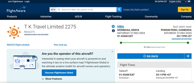 สายการบินไม่ใช่สายการบินโดยสารปกติ เป็นเครื่องเช่าเหมาลำ บินมาจากเคนย่า
