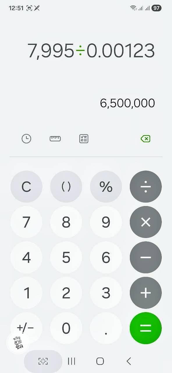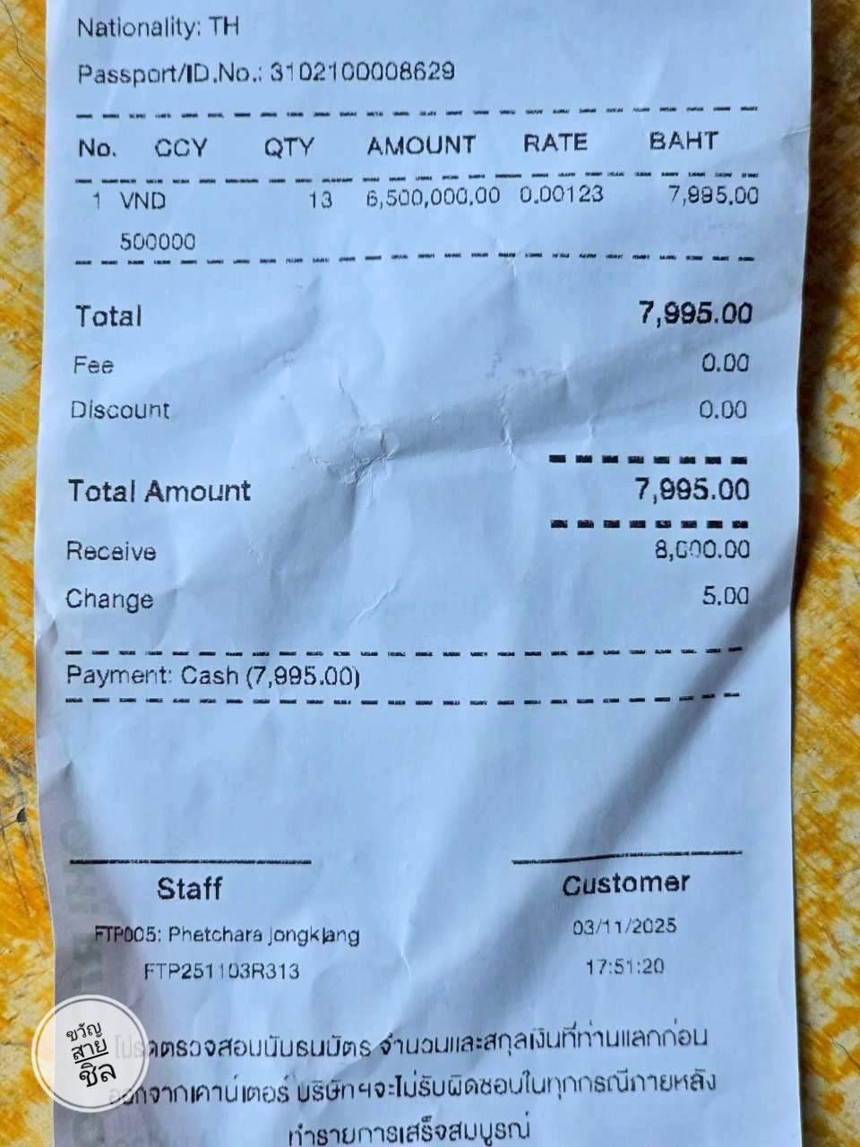 ยอดเงินไทยที่แลก 7995 ÷ 0.00123 ได้เงินVND มา 6,500,000 VND
