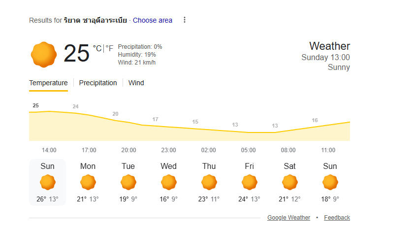 ตอนนี้ริยาด 17 องศา อุณหภูมิสูงสุดในตอนกลางวัน แดดออกเปรี้ยง ยังแค่ 26 องศา เท่านั้น ในขณะที่เชียงรายตอนนี้ 25 องศา สูงสุด 30 องศา