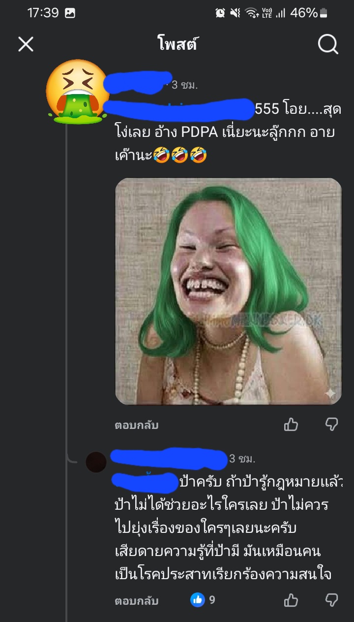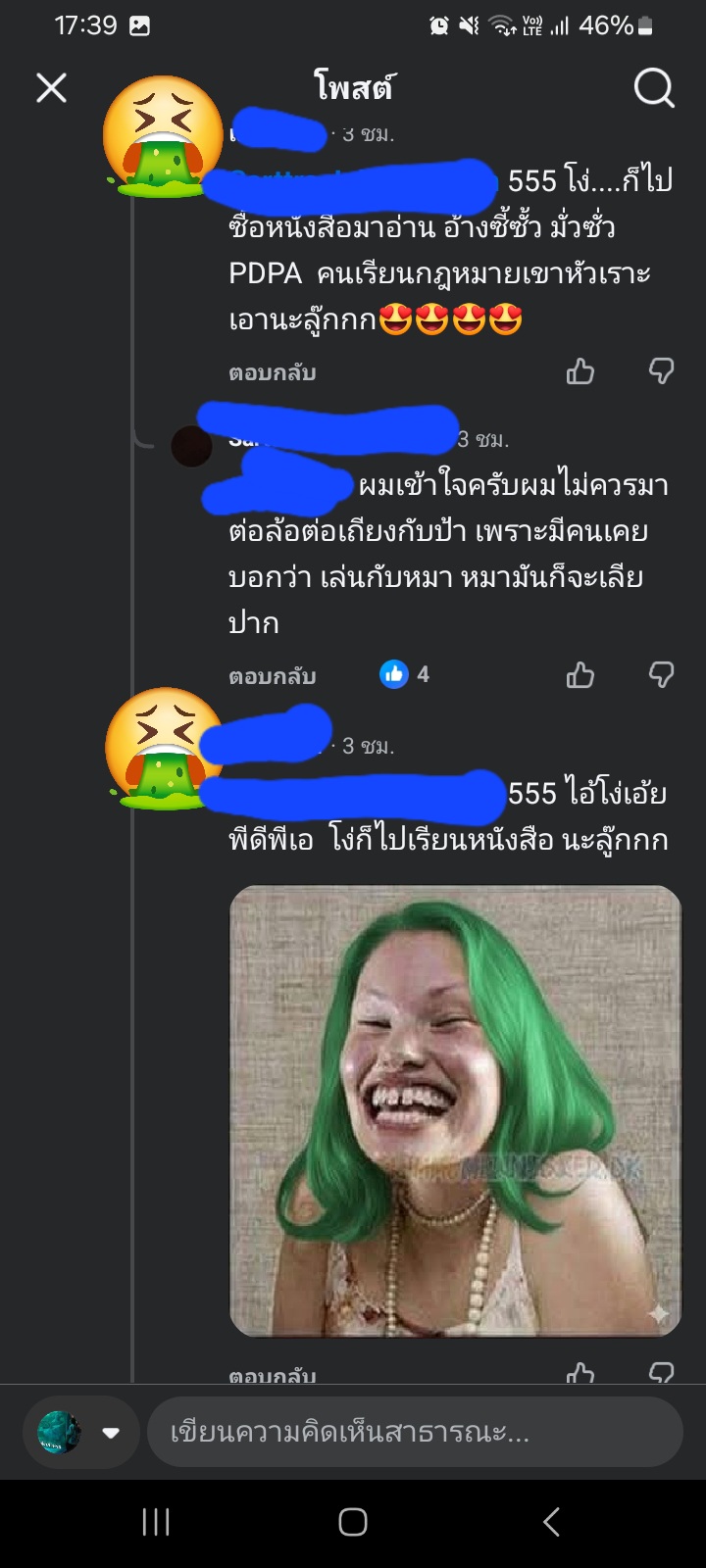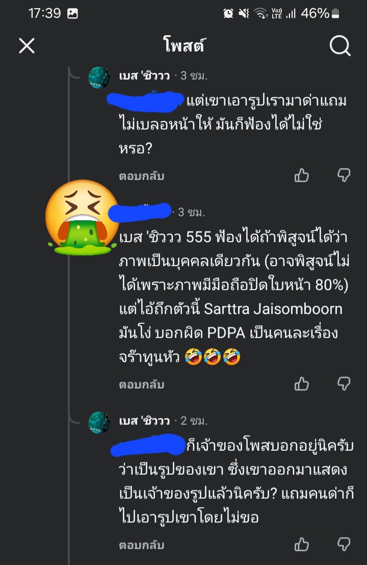 ตอนแรกเข้าไปตอบเม้นก่อนหน้าเกี่ยวกับPDPA แต่ทนายเขาตอบแบบนี้ได้ยังไงกับคนปกติ แถมเอารูปหน้าคนจริงมาใช้แบบไม่ขอกับเจ้าของอีก คิดเห็นกั