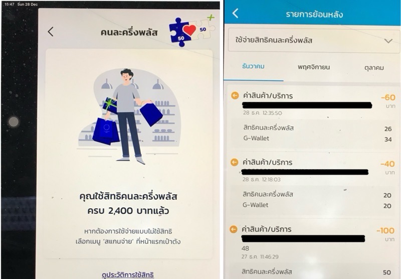 สรุปเฉพาะส่วนของ 2400 ที่รับการสนับสนุนจากรัฐนะครับ (ราคาเต็มต้องคูณสอง) ผมใช้ซื้อตั๋ว BTS ไป 368 ซื้อยา 92.5 ซื้ออุปกรณ์สำนักงาน 200 (จ่ายเต็มโควต้าของวัน) ที่เหลือเป็นของกินล้วน ๆ มีกินที่ร้านอาหาร 238 นอกนั้นคือ ซื้อเป็นถุงกลับบ้าน (กับข้าวบ้าง ขนม ของกินเล่นบ้าง)