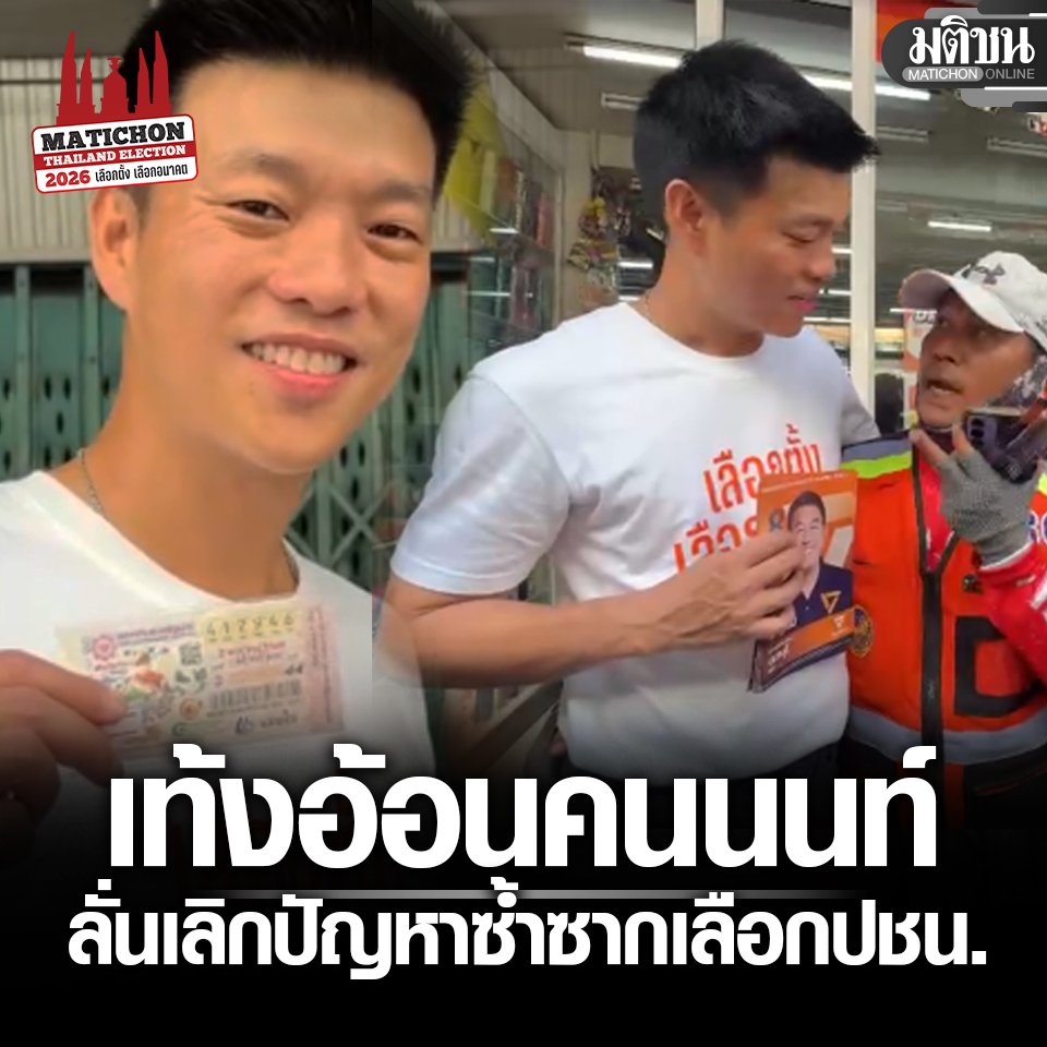 เท้ง ประเดิมลุยหาเสียงนนทบุรี แวะซื้อล็อตเตอรี่เลข 46 ขุดเรื่องราวตึกถล่ม-น้ำท่วม โจมตีฝั่งตรงข้าม บอกคนตายเป็นร้อยๆ คน พอได้แล้วกับปัญหาซ้ำซากแบบนี้ ขอ ปชช. กาพรรคประชาชน 2 ใบ ลั่น เราเอาจริง! ด้านแม่ค้าปลอกส้มให้ชิม ทำเจ้าตัวยิ้ม ตอบไป ‘ส้มหวานครับ’