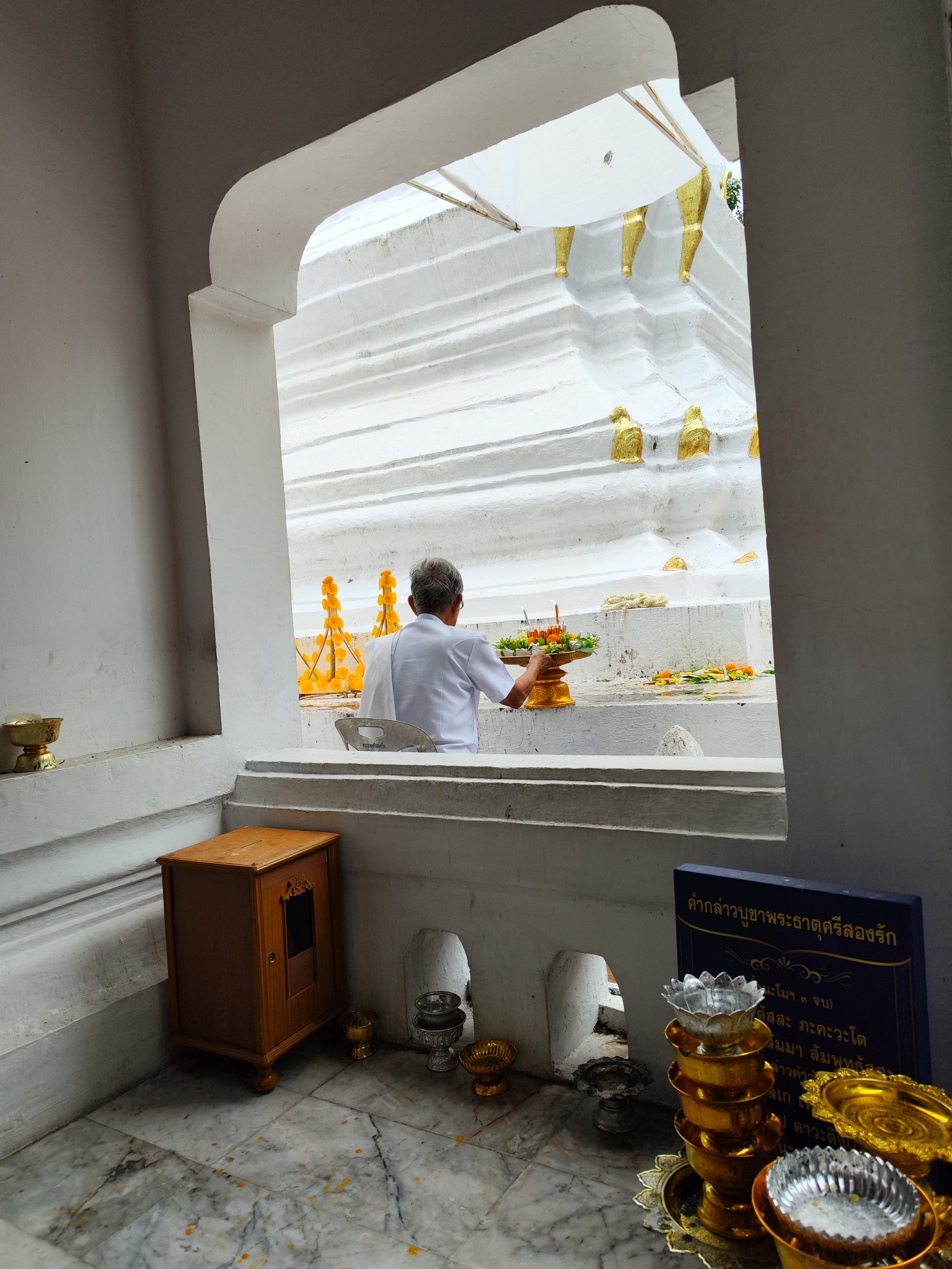 จังหวะทำพิธีไม่มีอะไรมากค่ะ เราแค่เข้าไปนั่งสวดคำกล่าวบูชาพระธาตุศรีสองรัก แล้วก็ทำตามคำแนะนำของพ่อแสนไปทีละขั้น แปบเดียวเสร็จละ ส่วนบทสวดก็ไม่ต้องกลัวท่องผิด เพราะเขามีป้ายให้อ่านตามได้