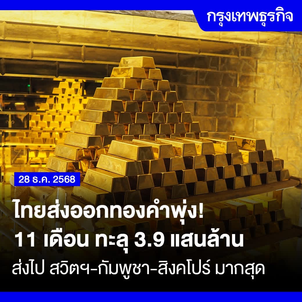 ไทยส่งออกทองคำพุ่ง! 11 เดือน ทะลุ 3.9 แสนล้าน ส่งไป สวิตฯ-กัมพูชา-สิงคโปร์ มากสุด
