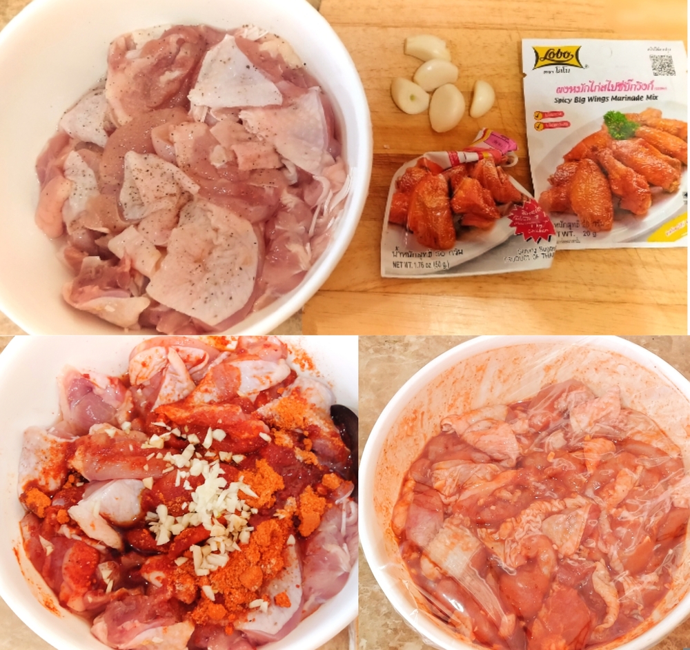 2. นำไก่ที่ล้างไว้มาหมักด้วย ผงหมักไก่ กระเทียม พริกไทย รสดี น้ำตาล ซีอิ้วขาว แล้วเอาพักไว้ในตู้เย็น 1 ชม.