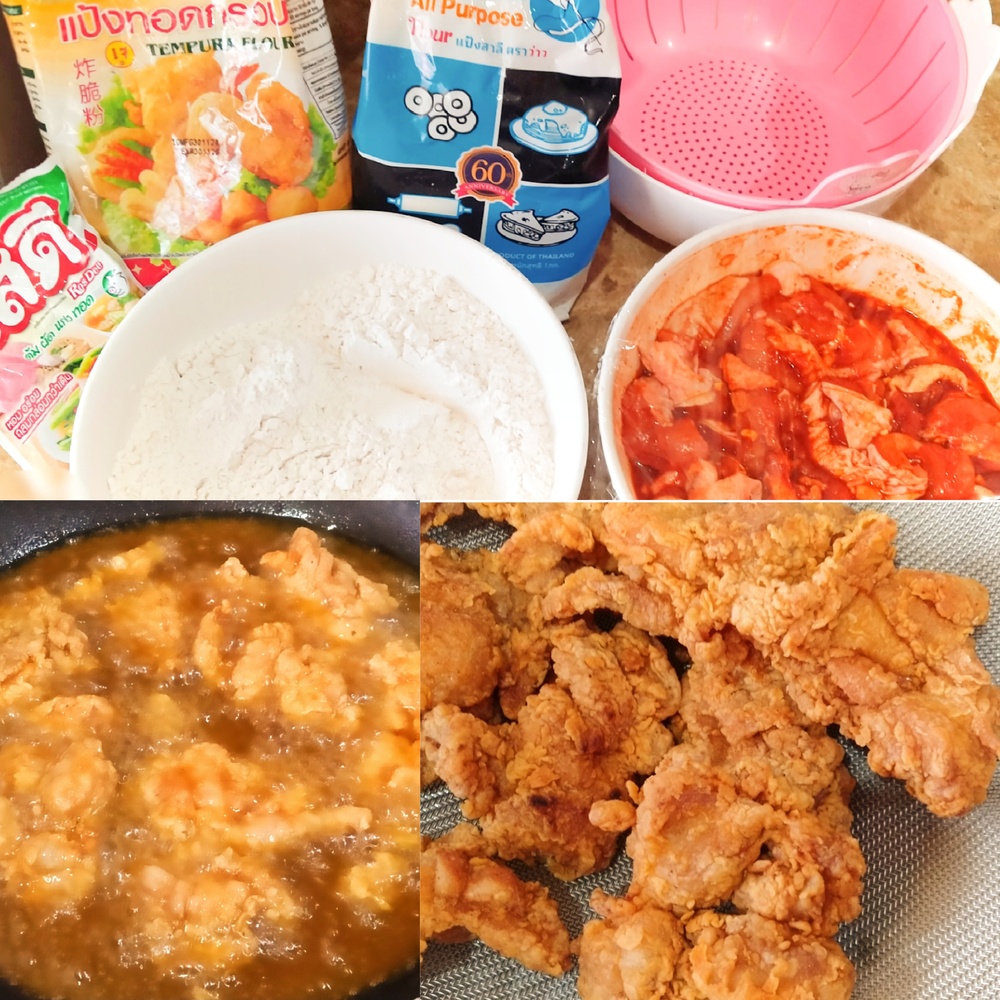 4. นำไก่ที่หมักไว้ครบเวลามาชุบแป้ง แล้วเอาไปจุ่มน้ำเย็น ก่อนเอามาชุบแป้งอีกครั้งให้ทั่ว