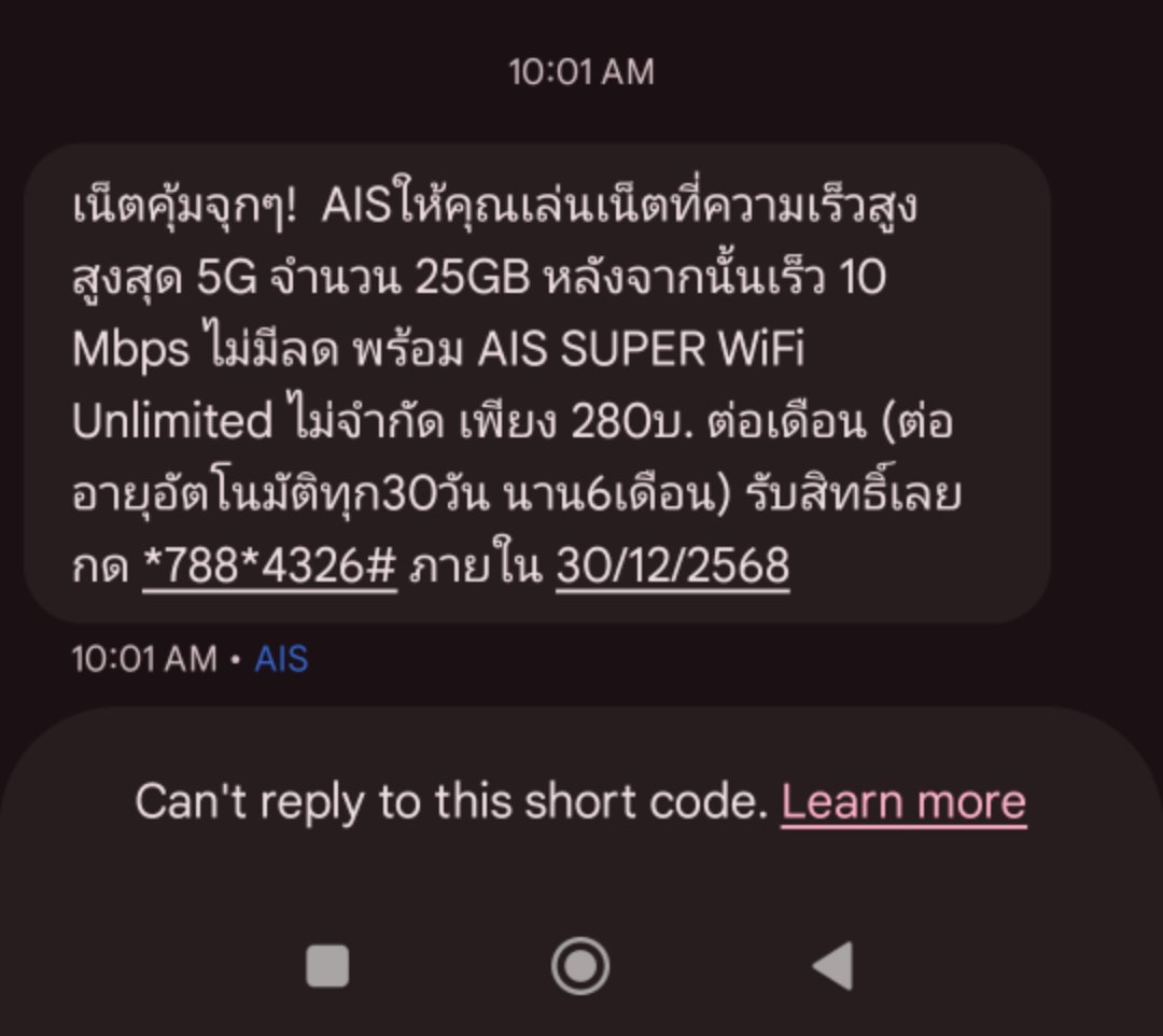ไดัรับ SMS จาก AIS แจ้ง ว่าเพียงเติมเงิน200บาท ไดัรับโปนัส100ฟรี จริงไหมครับ