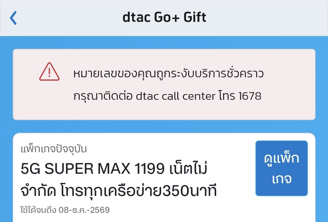 คือมีปัญหาเรื่องการถูกระงับเบอร์ จากDtac เพราะเราไปสมัครโปร1199 และเกินยอดวงเงินเลยเผลอปิดยอดวงเงิน ระบบแจ้งว่าเบอร์ถูกระงับเนื่องจากใชเกินยอมวงเงินที่กำหนด และทีนี้ไม่สามารถเปิดหรือกำหนดยอมวงเงินได้ร่วมไปถึงติดต่อทางดีแคค่อนข้างยากและยังไม่สามารถติดต่อได้และโปรนี้ผมไม่สามารถรับสิทธิได้เพราะใช้เกินวง และเดือนธันวามียอดค่าชำระมา405 จึงอยากให้ทางดีแทคช่วยติดต่อ