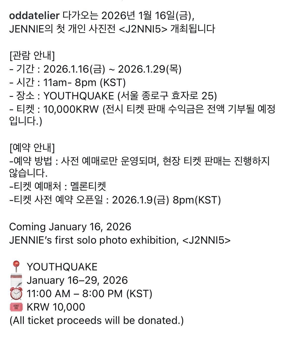 JENNIE จะจัดนิทรรศการภาพถ่ายครั้งแรก <J2NNI5> ที่โซลในวันที่ 16 - 29 มกราคมนี้ รายได้จากการขายตั๋วทั้งหมดจะนำไปบริจาค 🤍