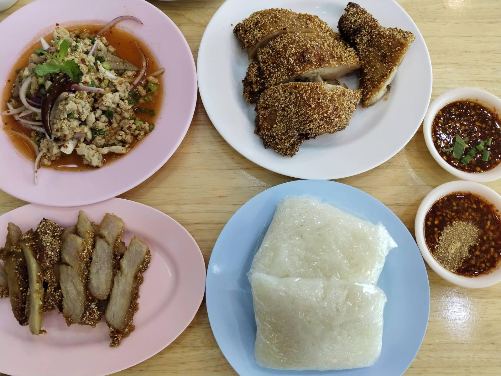 คอหมูย่างข้าวคั่ว น้ำจิ้มแจ่ว ลาบหมู ไส้กรอกอีสาน