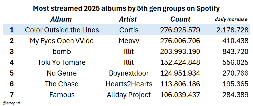 ภายในระยะเวลาประมาณเพียง 4 เดือน อัลบั้มเดบิวต์ “Color Outside the lLines” ของ Cortis ก็กลายเป็นอัลบั้มที่มียอดสตรีมมากที่สุดในปี 2025 ของ KPOP รุ่นที่ 5 ด้วยยอดสตรีม 276,925,579 ครั้งและยอดผู้ฟังรายเดือนนิวพีคที่ 8,084,400 !