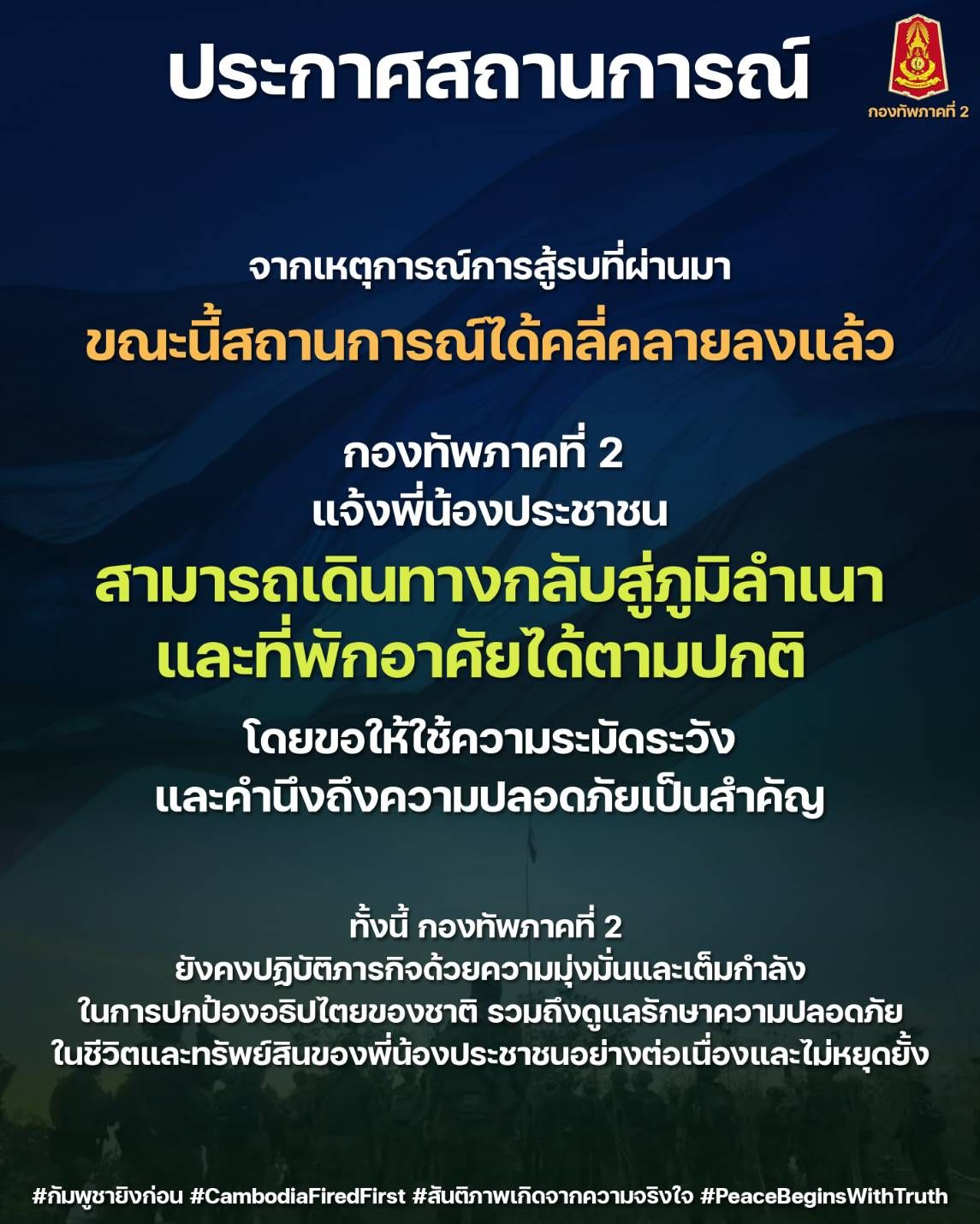กองทัพภาคที่ 2 📢 แจ้งพี่น้องประชาชนสามารถเดินทางกลับสู่ภูมิลำเนา และที่พักอาศัยได้ตามปกติ