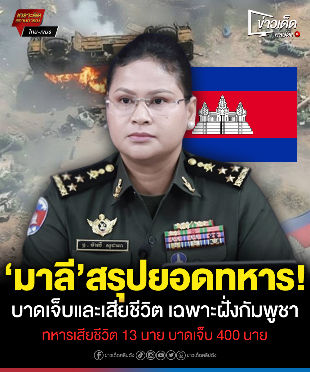 "มาลี โสเจียตา" โฆษกกลาโหมกัมพูชา รายงานหลังจากไทย กัมพูชา ลงนามหยุดยิvแล้ว สรุปยอดทหๅร บๅดเจ็บและเสียชีวิต เฉพาะฝั่งกัมพูชา ทหๅรเสียชีวิต 13 นาย บๅดเจ็บ 400 นาย !