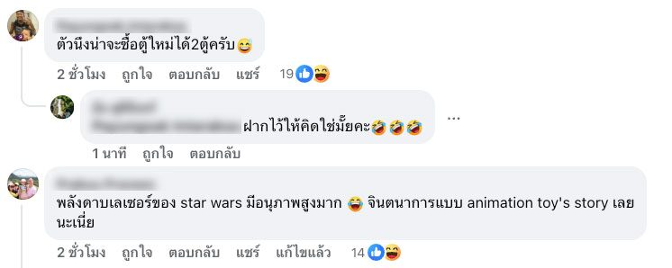 โชคดีมากจริงๆ แต่สามีกับลูกชายน่าจะโชคร้ายเพราะราคาที่แท้จริงของโมเดลหุ่นยนต์มาโป๊ะตอนตู้แตก เพราะเค้ารีบช่วยกันขนออกจากตู้บอกว่าเดี๋ยวมันพังแล้วเสียดาย แม่สงสัยว่าทำไมรีบขนออกจากตู้มันแพงหรอ ลูกชายบอกว่าแม่ไม่รู้น่าจะสบายใจกว่า แต่ตอนนี้แม่เริ่มไม่สบายใจแล้วค่ะ”