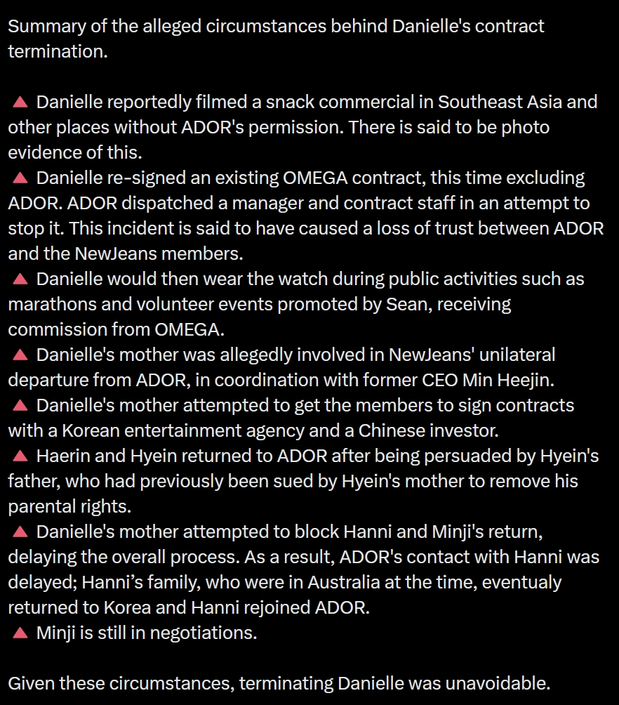 🔺 Danielle's mother attempted to block Hanni and Minji's return, delaying the overall process. As a result, ADOR's contact with Hanni was delayed; Hanni’s family, who were in Australia at the time, eventualy returned to Korea and Hanni rejoined ADOR.