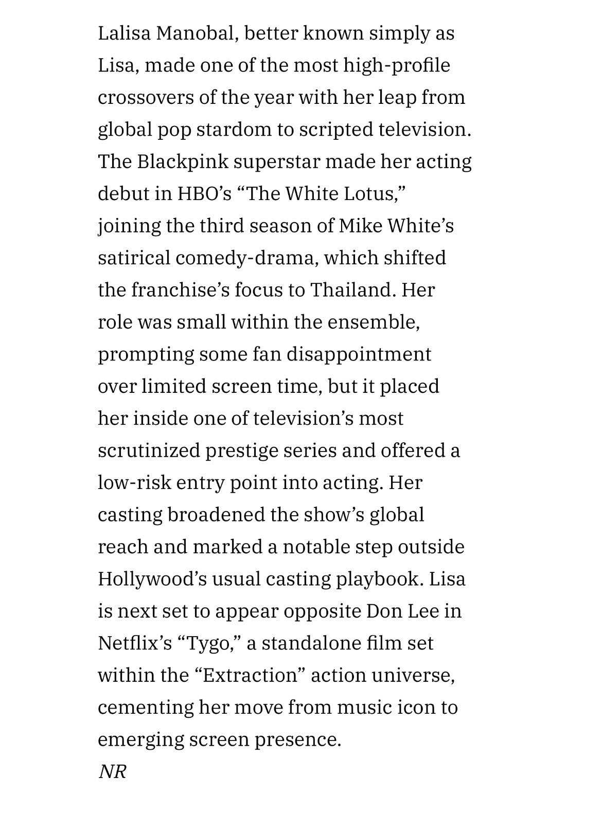 ลิซ่าได้รับการยกย่องจากนิตยสาร Variety ในฐานะหนึ่งในดาวรุ่งพุ่งแรงแห่งปีในวงการภาพยนตร์และโทรทัศน์ระดับนานาชาติ