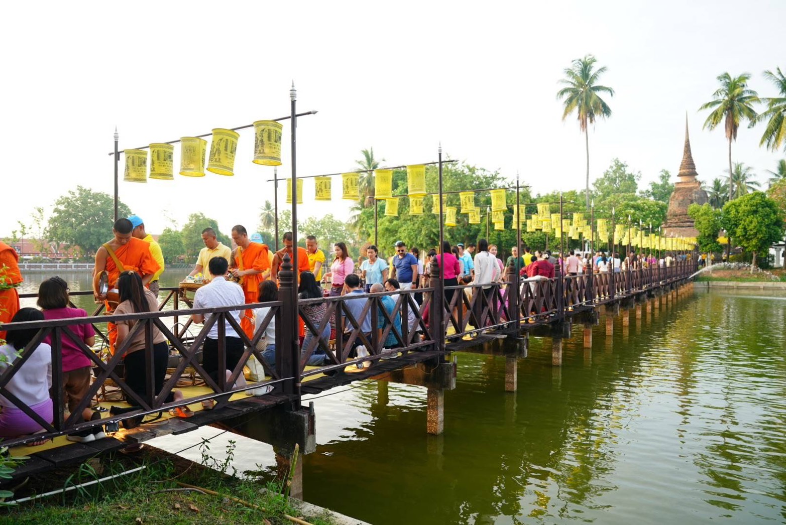 5. วัดตระพังทอง จังหวัดสุโขทัย ตั้งอยู่ในเขตอุทยานประวัติศาสตร์สุโขทัย มีภูมิทัศน์โดดเด่นด้วยเกาะกลางน้ำและสะพานเชื่อมสู่เจดีย์ประธาน กิจกรรม “ตักบาตรสะพานบุญ รับอรุณแห่งความสุข” ณ วัดตระพังทอง เป็นการเริ่มต้นปีใหม่ท่ามกลางโบราณสถานแห่งราชธานีเก่า “สุโขทัย” อันหมายถึงรุ่งอรุณแห่งความสุข และเป็นการเชื่อมโยงศรัทธาทางศาสนาเข้ากับรากเหง้าความเป็นชาติไทยอย่างลึกซึ้ง