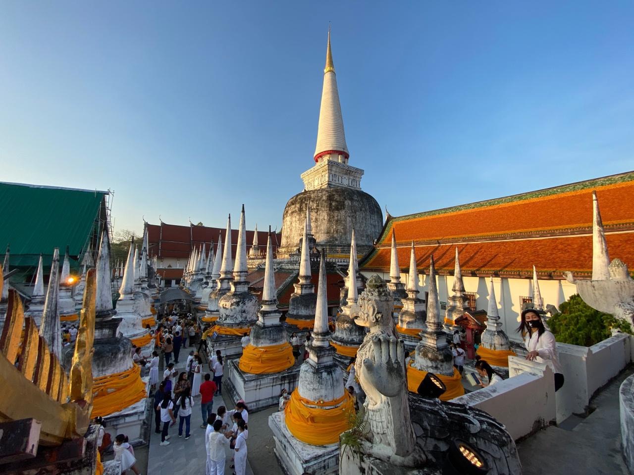 9. วัดพระมหาธาตุ จังหวัดนครศรีธรรมราช เป็นพระอารามหลวงชั้นเอก และเป็นศูนย์รวมจิตใจของชาวภาคใต้ องค์พระบรมธาตุเจดีย์ยอดทองคำเป็นที่บรรจุพระทันตธาตุของพระสัมมาสัมพุทธเจ้า การตักบาตรรับปีใหม่ ณ วัดแห่งนี้ จึงถือเป็นการสร้างบุญกุศลอันยิ่งใหญ่ และเป็นสิริมงคลสูงสุดแก่ตนเองและครอบครัว ตามคติความเชื่อที่สืบทอดกันมาอย่างยาวนาน