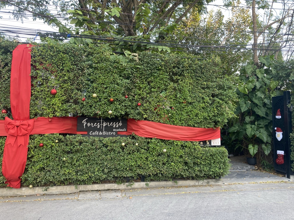 📍 เริ่มจากหน้าร้าน: กล่องของขวัญยักษ์ แค่มาถึงก็สะดุดตาแล้วครับ กำแพงต้นไม้หน้าร้านถูกคาดด้วยโบว์สีแดงขนาดยักษ์ เหมือนเดินเข้ากล่องของขวัญกล่องใหญ่ ต้อนรับเทศกาลกันตั้งแต่ทางเข้าเลย ใครขับรถผ่านต้องเหลียวมองแน่นอน