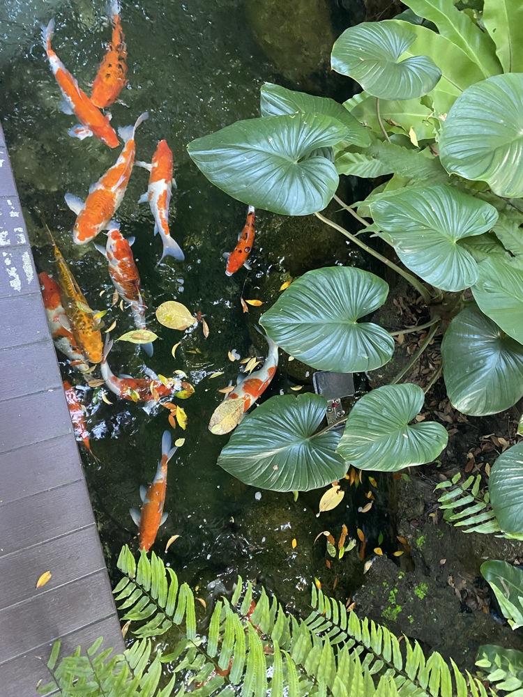 "น้ำตกจำลองและบ่อปลาคาร์ป" น้ำใสไหลเย็นเห็นตัวปลาชัดแจ๋ว น้องปลาคาร์ปสีสวยว่ายกันเพลินตามาก การได้มานั่งจิบเครื่องดื่มฟังเสียงน้ำตกเบาๆ ท่ามกลางสีเขียวแบบนี้ ช่วยฮีลใจจากความเหนื่อยล้าได้ดีสุดๆ ครับ