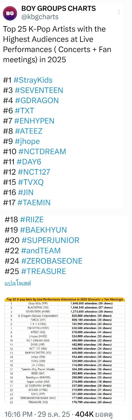 จากสถิตินับเฉพาะปี 2025 ถือได้ว่าเป็นศิลปิน K-Pop ที่มีผู้ชมมากที่สุดอันดับ 1 ในการแสดงสด (คอนเสิร์ต + แฟนมีตติ้ง)