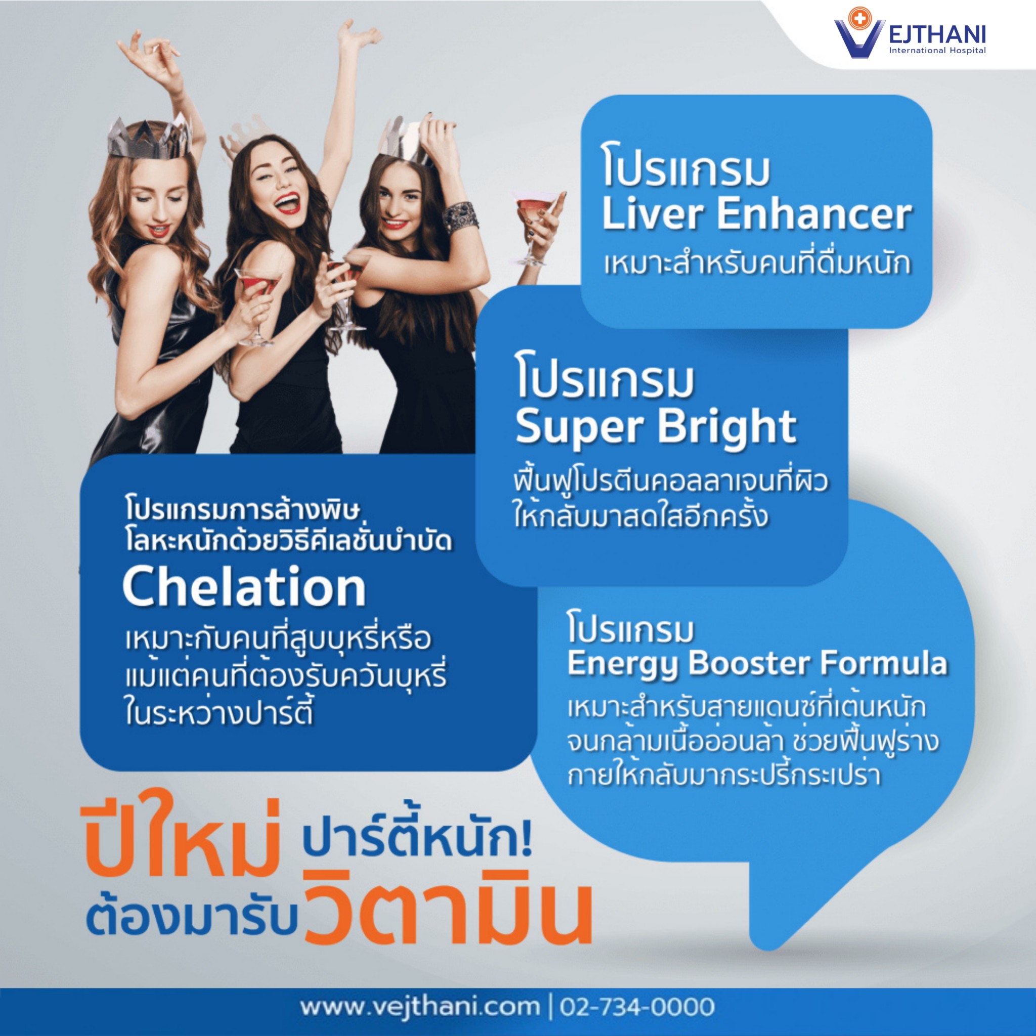 การปาร์ตี้แบบสุดเหวี่ยงหรือต่อเนื่องหลาย ๆ วัน อาจจะส่งผลกระทบต่อสุขภาพได้ไม่แพ้ความเครียดจากการทำงาน โปรแกรมฟื้นฟูร่างกายด้วยการให้วิตามินและสารอาหารที่สำคัญทางหลอดเลือด จึงเป็นทางเลือกที่สำคัญของคนรักสุขภาพ เพื่อลดอาการอ่อนล้าของร่างกาย เพิ่มความสดใสให้กับผิวพรรณ เสริมภูมิต้านทาน และช่วยสร้างฮอร์โมนในร่างกาย เป็นการเตรียมความพร้อมให้กับสุขภาพ เพื่อกลับมาทำงานได้อย่างเติมที่หลังปีใหม่ โดยแบ่งโปรแกรมฟื้นฟูร่างกายออกเป็น 4 แบบ ดังนี้