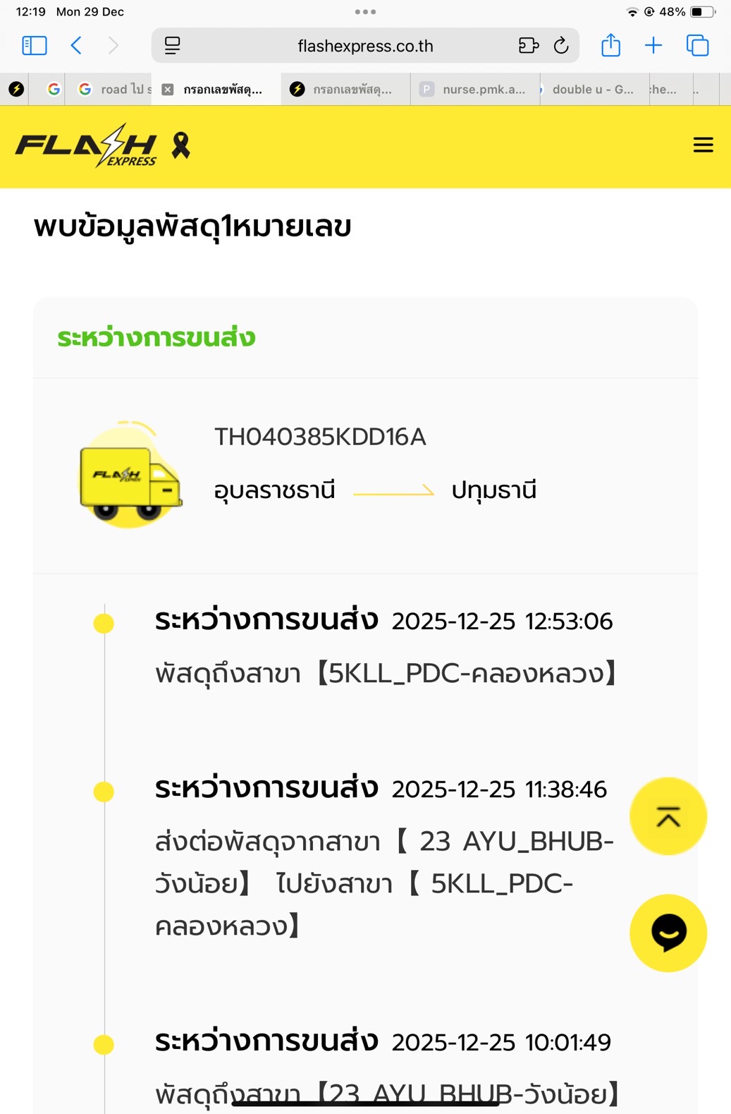 ในกรณีที่ส่งสินค้าตั้งแต่ 24 ธค 68 สถานะอัพเดตล่าสุดอยู่ที่คลองหลวง ตั้งแต่ 25 ธค 68