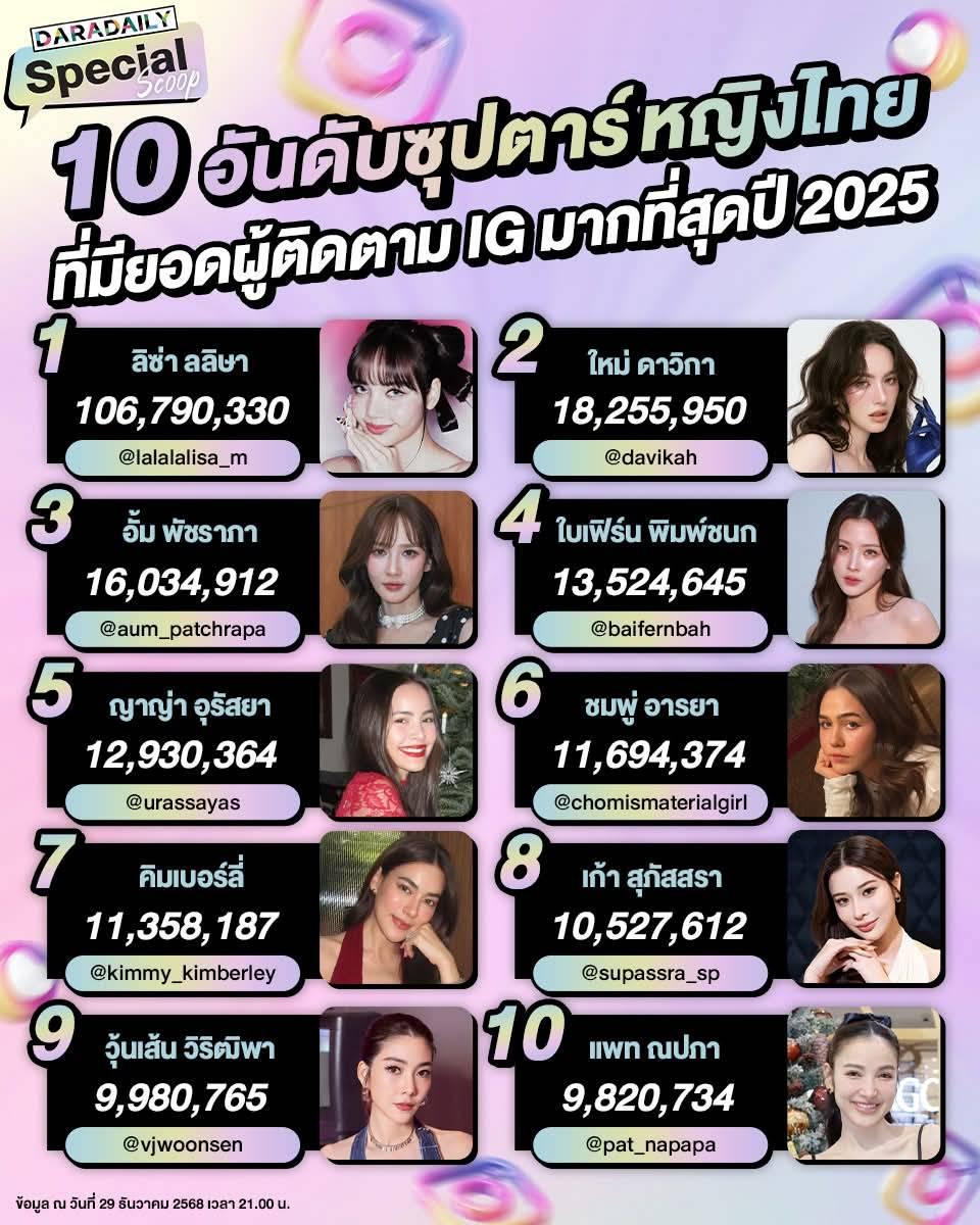 10 อันดับซุปตาร์หญิงคนไทย ที่มียอดผู้ติดตาม IG มากที่สุดปี 2025 ✨💟