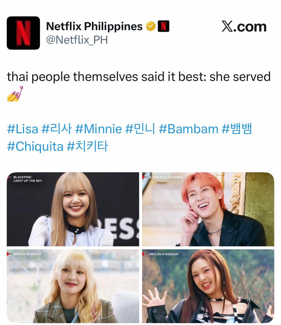 เพจทางการ Netflix Philippines ยกให้ CHIQUITA อยู่เคียงข้าง LISA , Minnie, BamBam คือศิลปินชาวไทยที่แสดงบนเวทีได้เป็นเลิศ