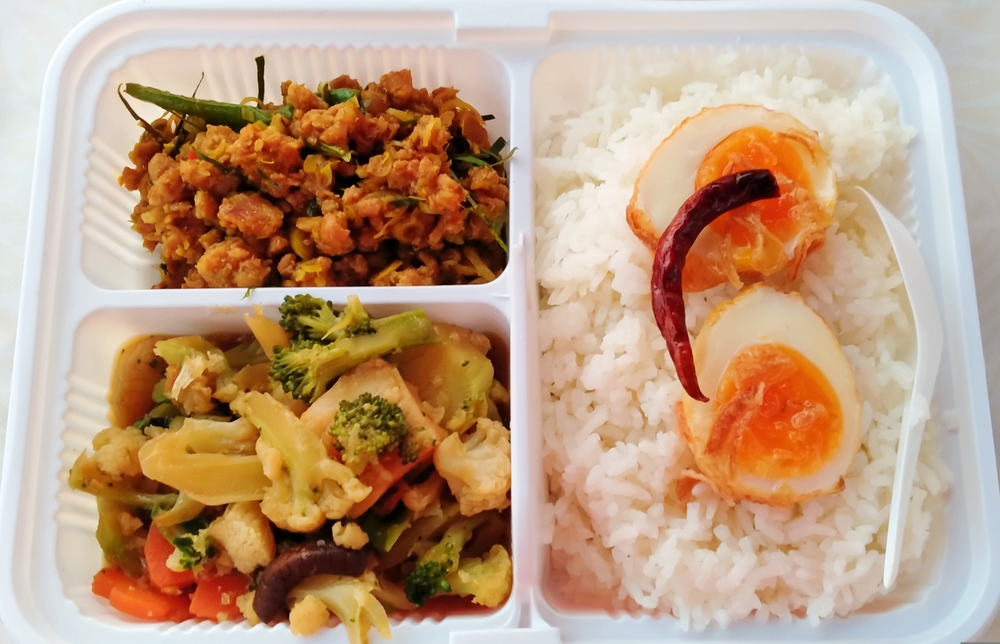ข้าวคั่วกลิ้งหมู + ผัดผัก + ไข่ลูกเขย 🍱🍖🥦
