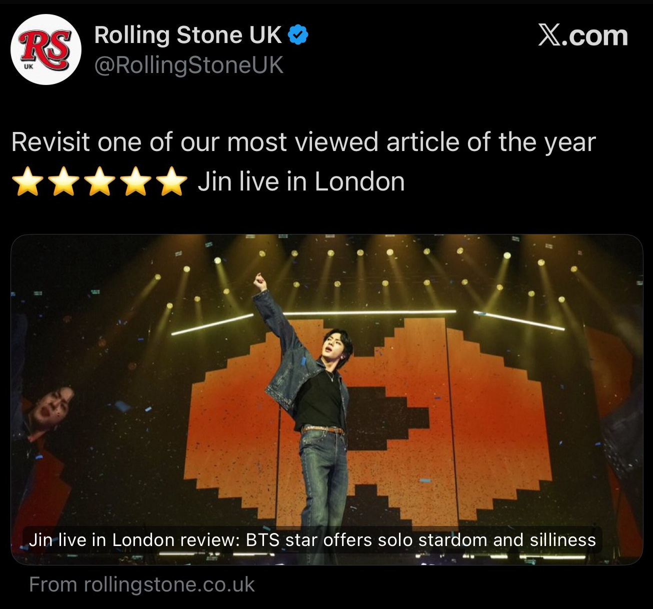 Rolling Stone UK  ประกาศว่า  บทความรีวิวคอนเสิร์ต "BTS  Jin  live in  London"  เป็นบทความที่มีผู้อ่านมากที่สุดแห่งปีของ  Rolling Stone UK