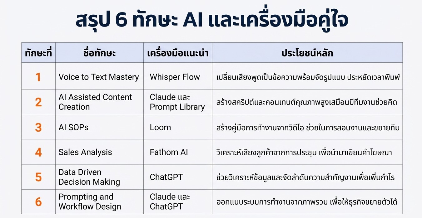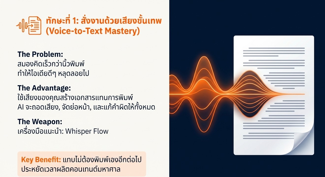 คำตอบ แนะนำให้เริ่มจากทักษะ Voice to Text หรือ AI Assisted Content Creation ก่อน เพราะเป็นสิ่งที่เห็นผลลัพธ์ได้ทันที ช่วยลดเวลาในการผลิตชิ้นงานรายวันได้มากที่สุด
